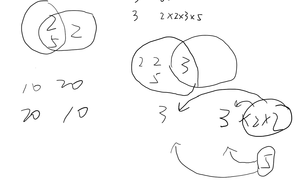 对于 10 和 20 的用例来说, 由于要组成的数的最大公因数是 10, 所以它们里面必须得有 2 和 5, 而韦恩图外圈的 2 不可能俩数都有, 不然这个 2 就变到中间去了, 于是有 [10 20] [20 10] 两种组合