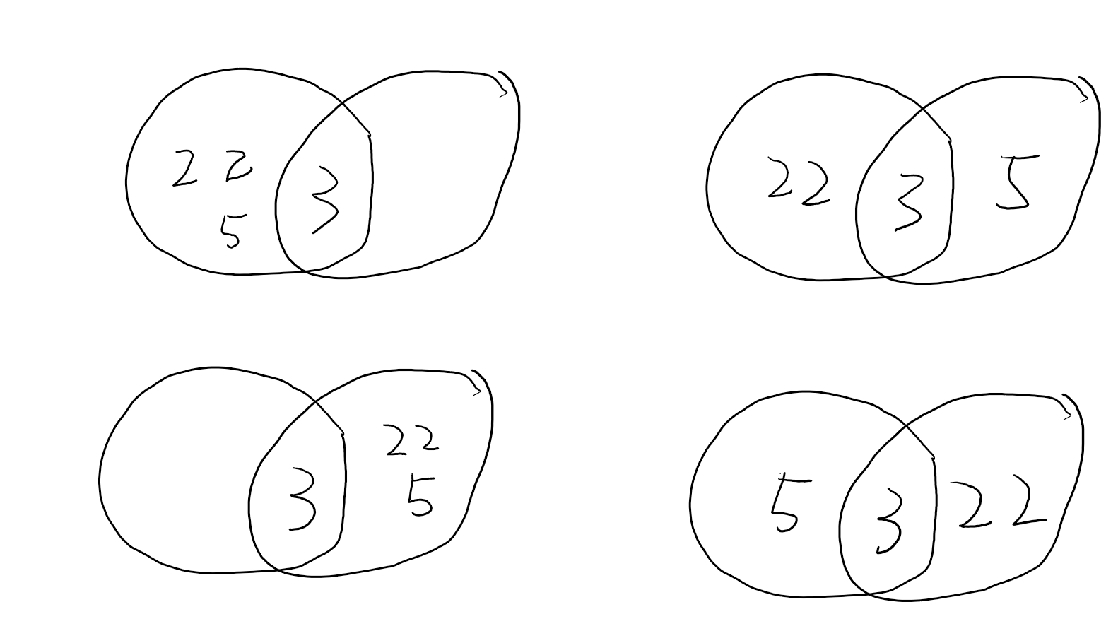 对于另一个用例, 最大公因数是3, 而 2 2 5.. 这两个 2 必须得放到两个数之一里, 不然就拆不出这种结果, 而如果两个2分居两个数体内, 就会造成上面跑到韦恩图中间的结果..