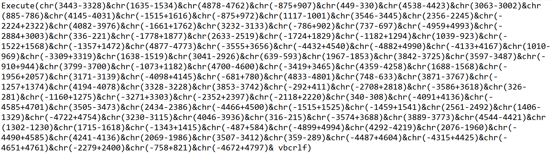 var s = "3443-3328)&chr(1635-1534)...&chr(-758+821)&chr(-4672+4797";