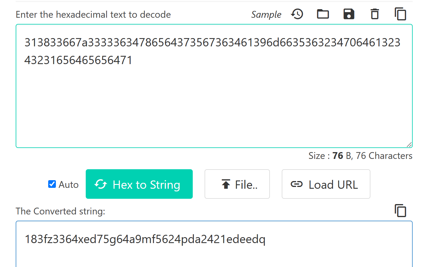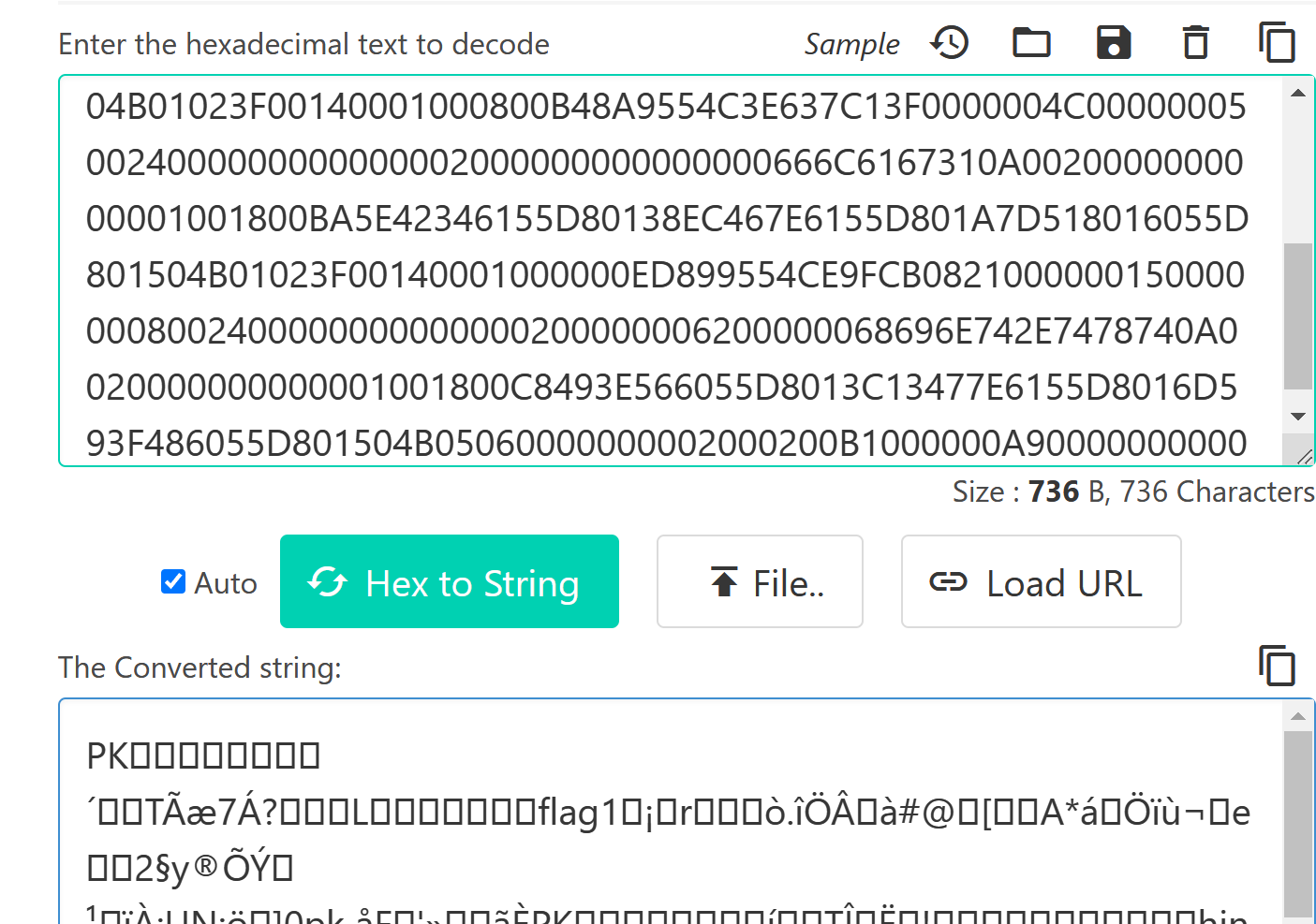 好像看起来很长不是 MD5 ,而且是 16 进制于是 hex->string: